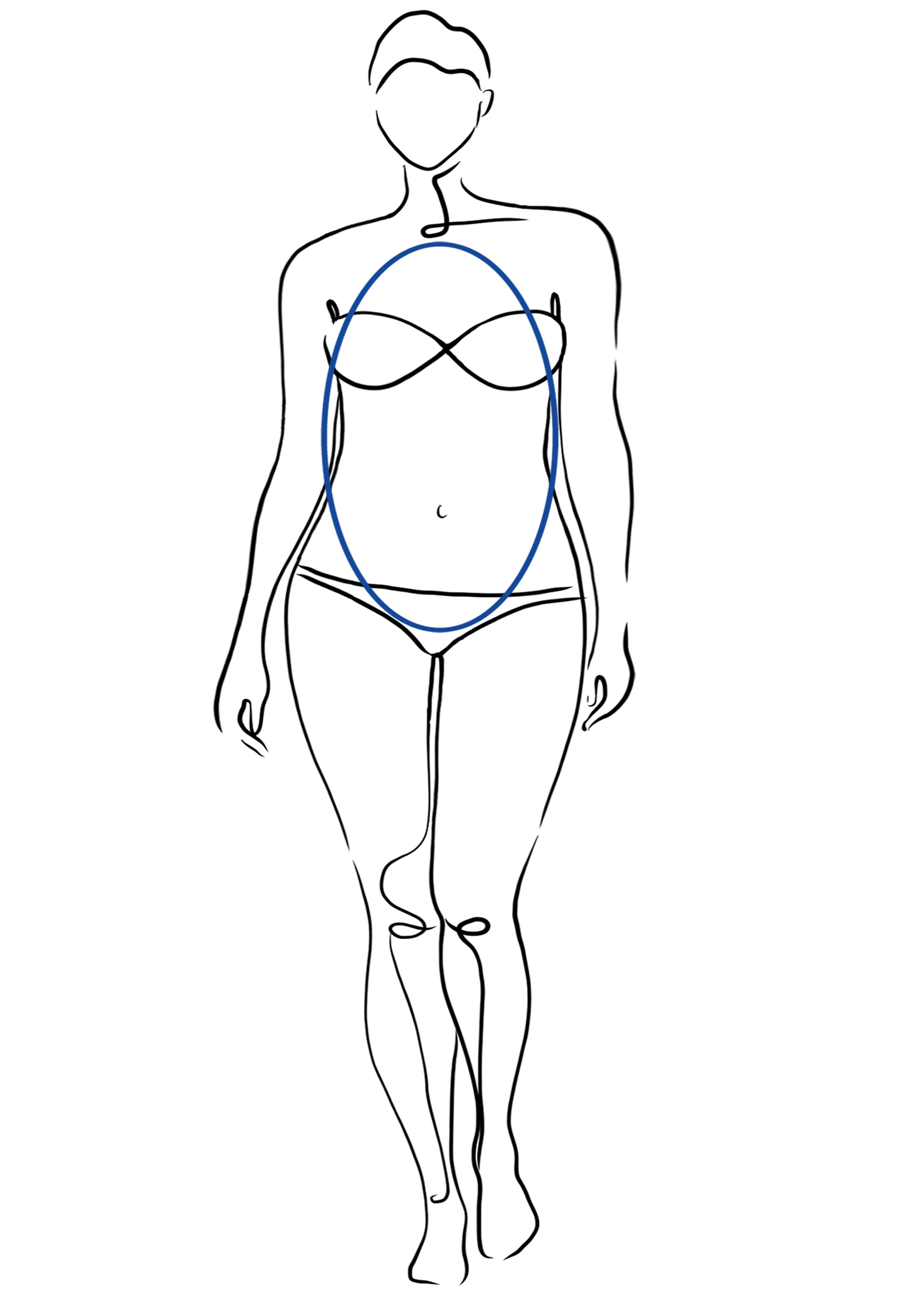 Bei der O-Silhouette liegt der Schwerpunkt in der Körpermitte. Die Taille ist weniger stark ausgeprägt, stattdessen zeigt sich eine weiche, runde Linienführung im Bauchbereich. Dieser Figurtyp besticht durch schöne Beine und ein elegantes Dekolleté. Mit den passenden Schnitten lässt sich die Silhouette optisch strecken und ausgleichen.